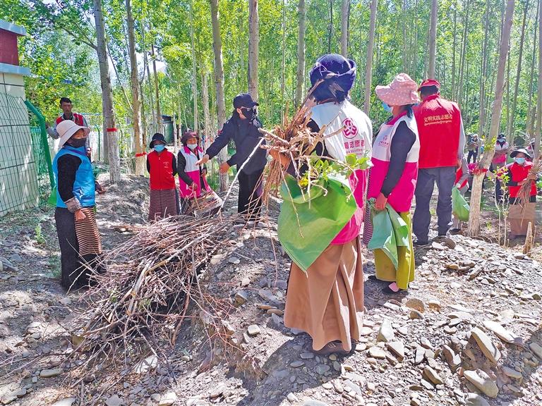 圖為黨員與群眾一起撿拾樹(shù)枝。記者 丹增平措 攝