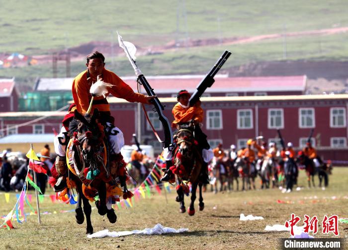 資料圖為玉樹州雜多縣瀾滄江源生態(tài)文化旅游系列活動開幕式上的馬術表演。薛蒂 攝