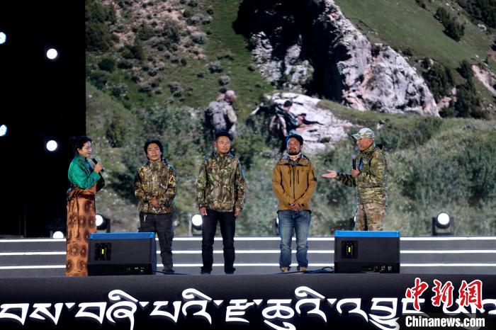 資料圖為紀錄片《雪豹和她的朋友們》導演奚志農(右一)在雜多縣分享創(chuàng)作背后的故事。薛蒂 攝