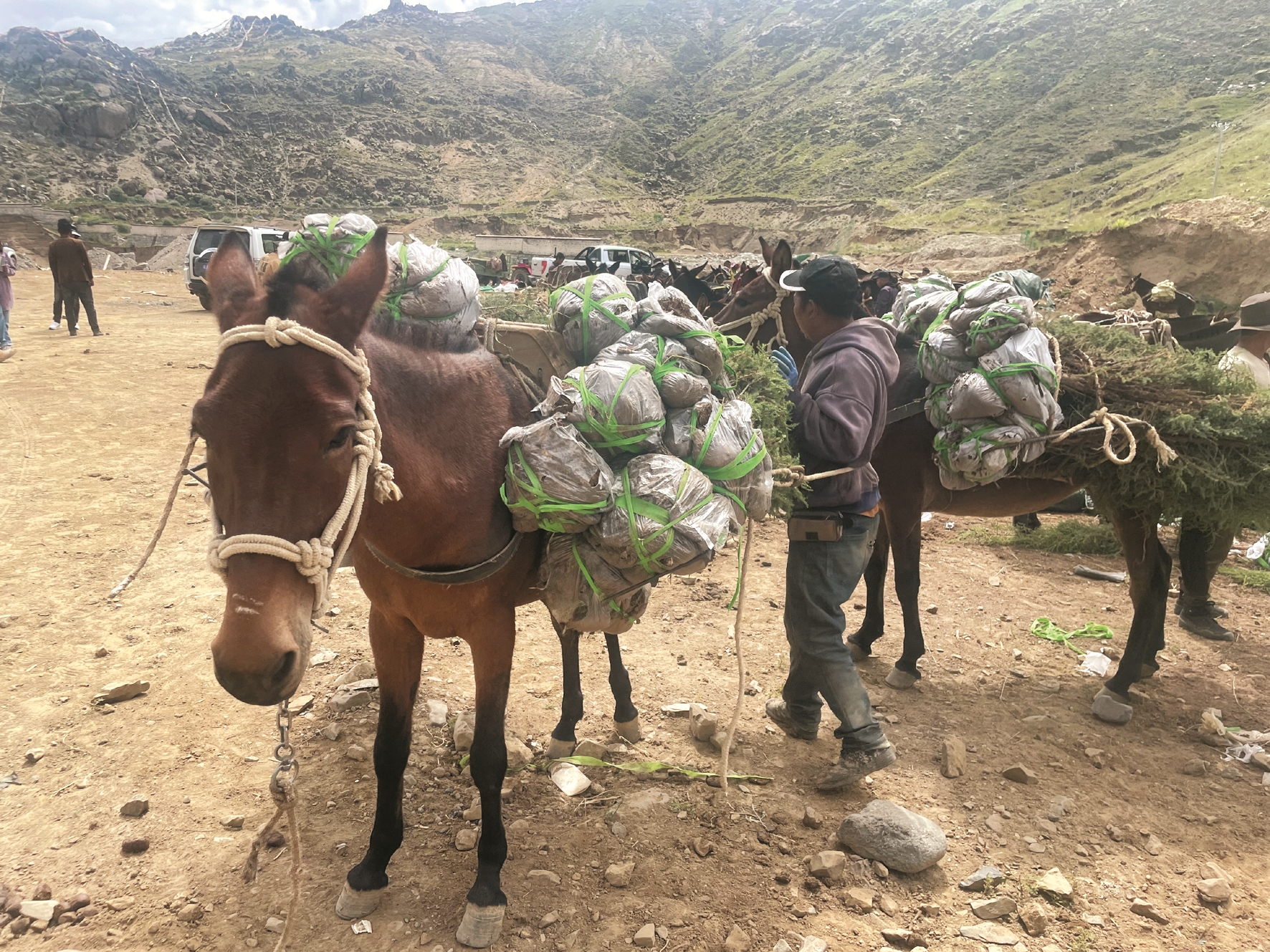 在堆龍德慶區(qū)乃瓊鎮(zhèn)色瑪造林片區(qū),植樹造林面積有4876.2畝,種植沙棘、祁連圓柏、油松等苗木共計(jì)58.79萬株。該植樹造林點(diǎn)位于山頂,山路陡峭,為了將苗木運(yùn)送上山,施工單位雇傭了群眾騾馬隊(duì),每天保障100匹騾馬幫助運(yùn)送苗木。施工現(xiàn)場,騾馬隊(duì)按規(guī)范將苗木進(jìn)行分裝,每匹騾馬分裝苗木10余株,運(yùn)送上山后由工人栽種。騾馬隊(duì)每天能運(yùn)送苗木5000株。