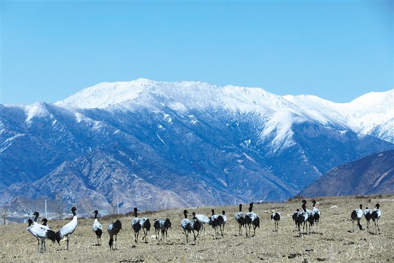 國家一級保護動物黑頸鶴在墨竹工卡縣境內的農田里覓食。