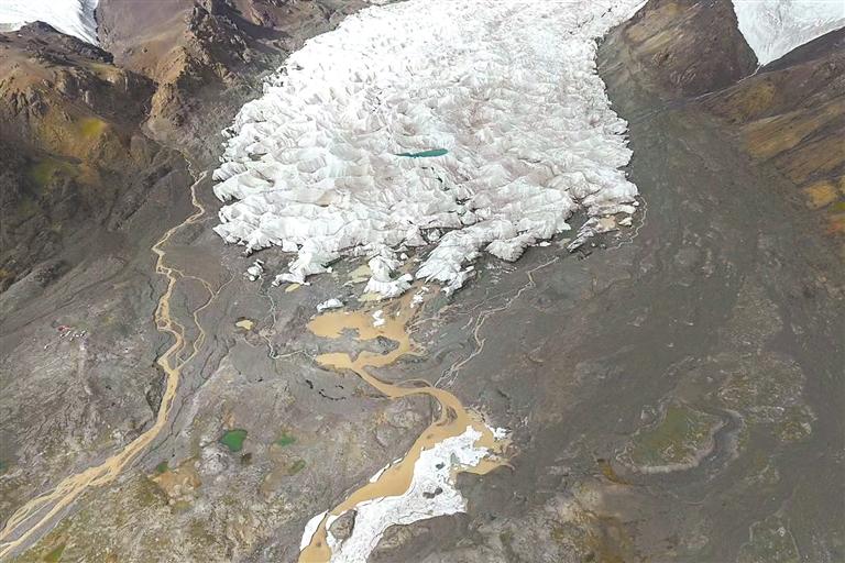 圖為長(zhǎng)江源頭格拉丹東雪山姜根迪如冰川。(無(wú)人機(jī)拍攝)記者 曲珍 攝