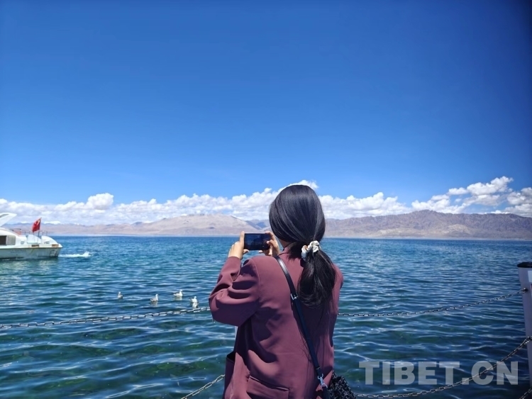 圖為游客在班公錯(cuò)拍景色 攝影:次旦拉姆