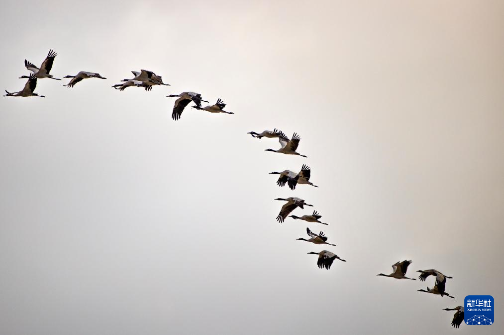 這是12月5日清晨在拉薩市林周縣虎頭山水庫(kù)拍攝的越冬黑頸鶴。新華社記者 曹檳 攝