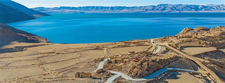 在當惹雍錯湖畔,尼瑪縣甲谷鄉(xiāng)吉松村剛剛竣工的棧道和觀景臺(無人機照片)。新華社記者 格桑朗杰 攝