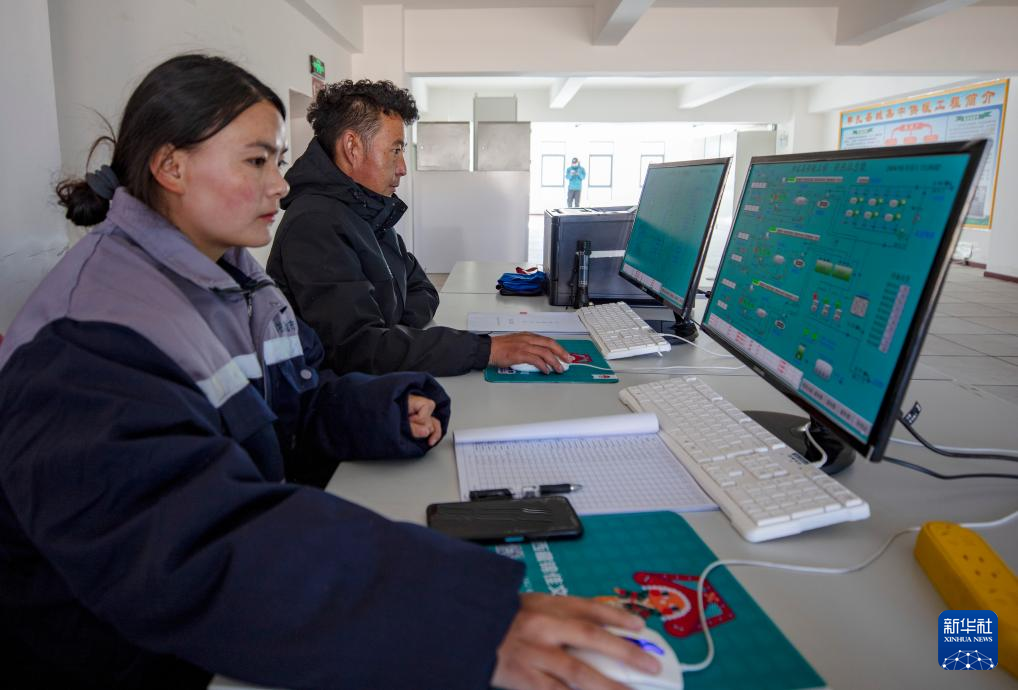 供暖工程的運維管理方申扎凈地市政管理有限公司經理楊參奎(后)和同事在管理系統(tǒng)上監(jiān)控供暖系統(tǒng)運行(1月6日攝)。新華社記者 姜帆 攝