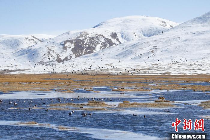 2023年11月15日,成群斑頭雁在青海隆寶灘國(guó)際重要濕地內(nèi)展翅飛翔。 記者 馬銘言 攝