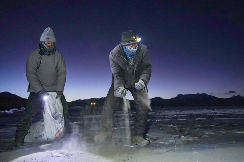 2月1日凌晨5點(diǎn),記者從浪卡子縣趕往推瓦村。村口停放的小貨車(chē)?yán)?,整齊地堆放著裝有爐灰的麻袋。村民旺堆告訴記者,冬季里,推瓦村草場(chǎng)不能為羊群提供充足的牧草,而普莫雍措湖心島有著豐茂的水草。因此,在普莫雍措結(jié)冰期,村民們會(huì)將羊群趕到湖心島,湖面解凍前再把羊群趕回村里。