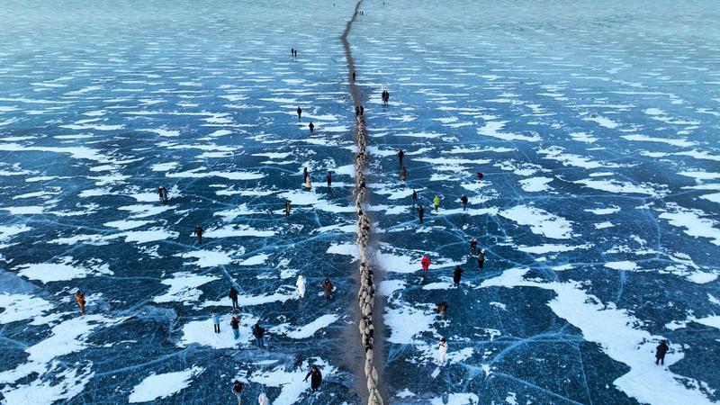 去往湖心島的路程大約3公里,走在冰面上,偶爾響起的冰層破裂聲還是讓人不由得心驚。此刻,幾百只羊宛如一條長(zhǎng)長(zhǎng)的直線(xiàn),在牧羊人的指揮下緩慢前行。金色的太陽(yáng)露出地平線(xiàn),羊群的影子投射在藍(lán)色的冰面上,美不勝收。