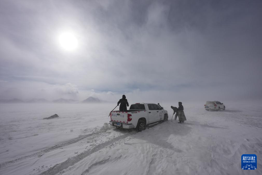 瑪曲鄉(xiāng)長江源黨員環(huán)保志愿隊(duì)巡邏途中車輛陷入雪中后進(jìn)行自救(2024年2月2日攝)。新華社記者 晉美多吉 攝