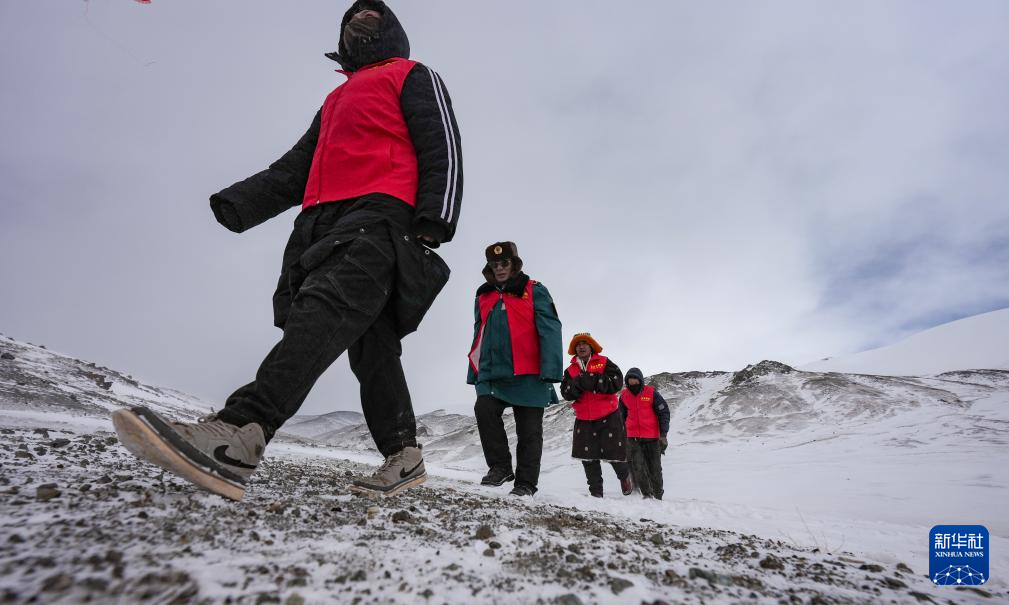 瑪曲鄉(xiāng)長江源黨員環(huán)保志愿隊(duì)年近七旬的才嘎老人(左二)在巡邏守護(hù)長江源(2024年2月2日攝)。新華社記者 晉美多吉 攝