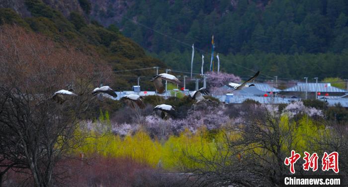 西藏林芝:黑頸鶴與雪山桃花共繪生態(tài)畫卷