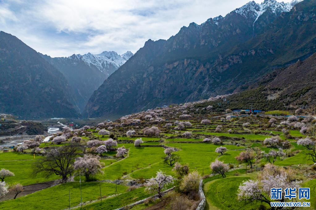 4月18日,在嘉黎縣尼屋鄉(xiāng)境內(nèi)田間盛開的桃花(無人機照片)。新華網(wǎng) 旦增努布 攝