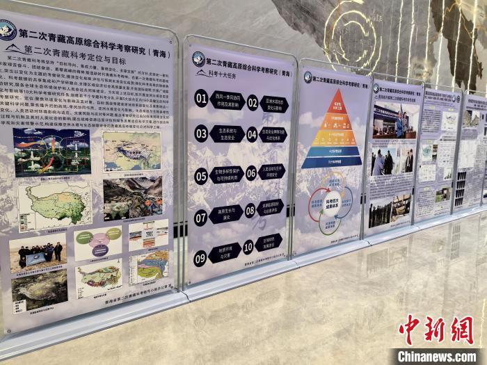 圖為第二次青藏科考成果助推青海交通高質(zhì)量發(fā)展對接會(huì)場外展板,展示科考項(xiàng)目。 祁增蓓攝