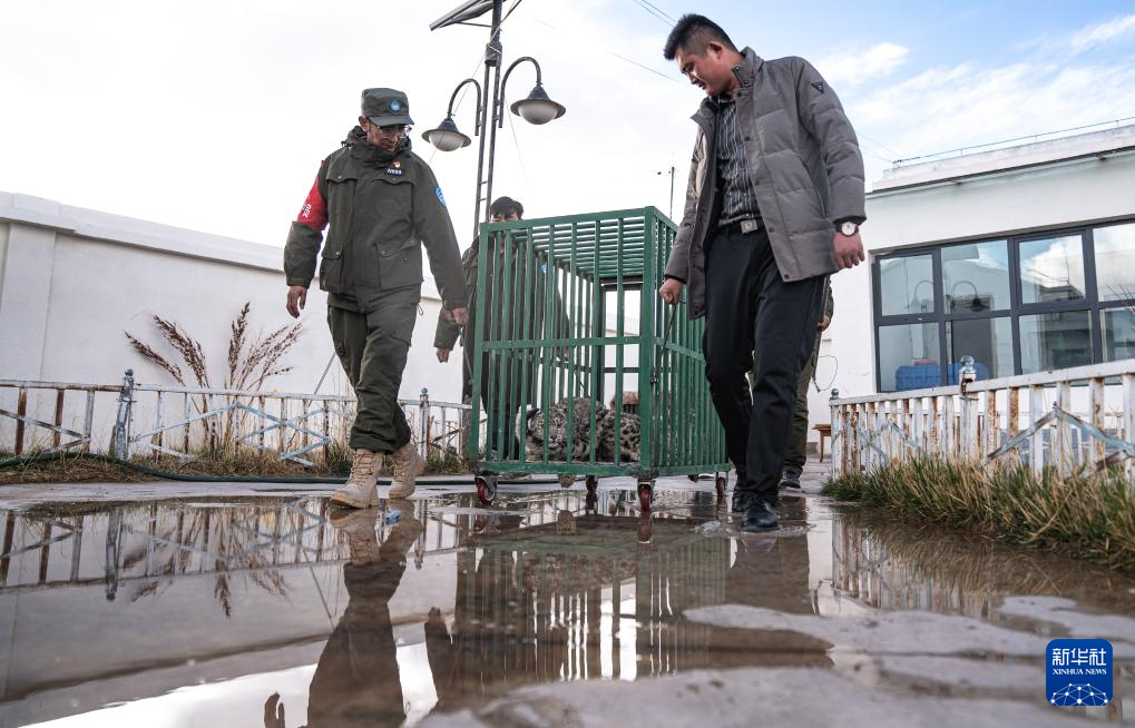 尼瑪縣野生動物管護(hù)隊(duì)員在運(yùn)送即將放歸自然的雪豹(5月13日攝)。新華社記者 丁增尼達(dá) 攝