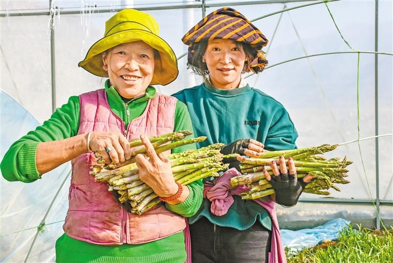 圖為大棚內(nèi),員工展示新鮮的有機蘆筍。記者 劉楓 攝