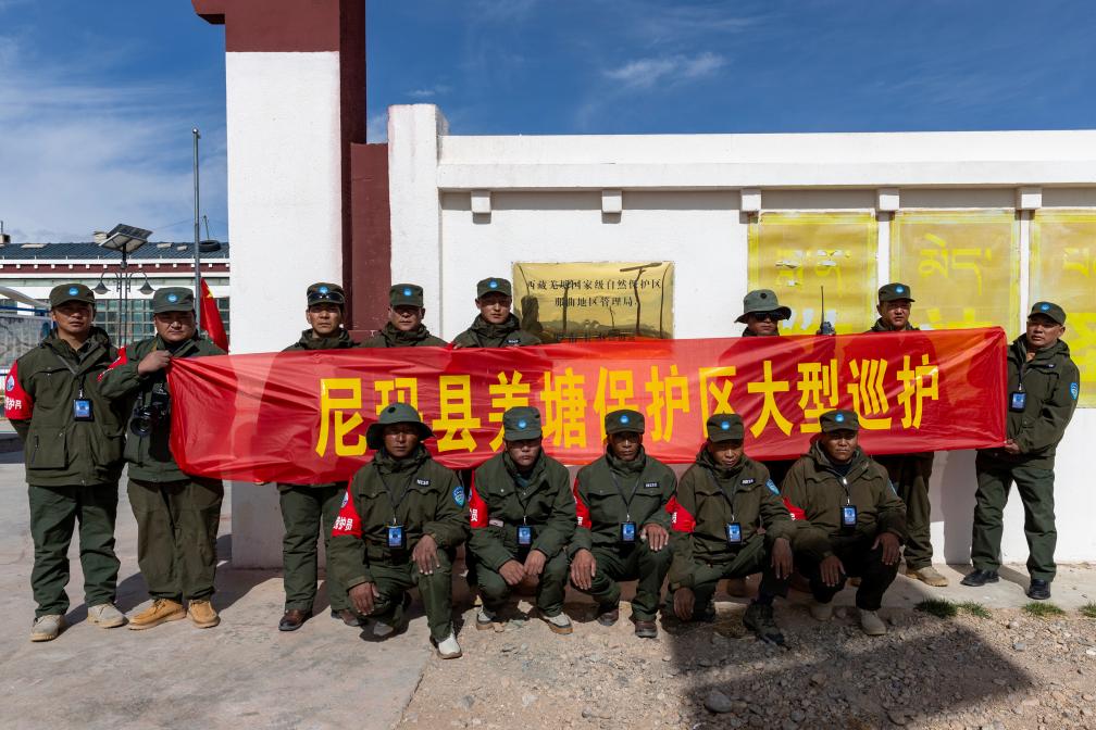 野生動(dòng)物專業(yè)管護(hù)隊(duì)員出發(fā)巡護(hù)前在尼瑪縣縣城的羅布玉杰管護(hù)站合影(5月7日攝)。新華社記者 姜帆 攝