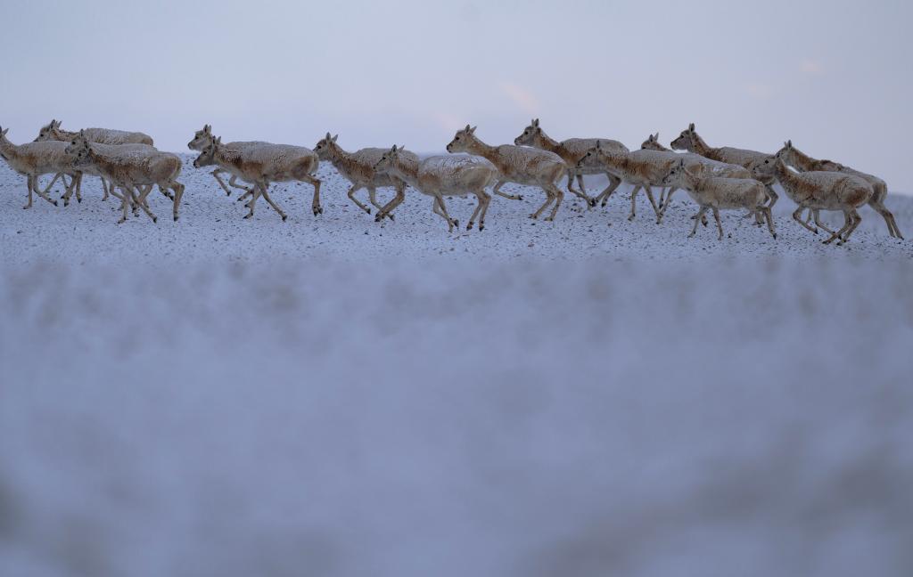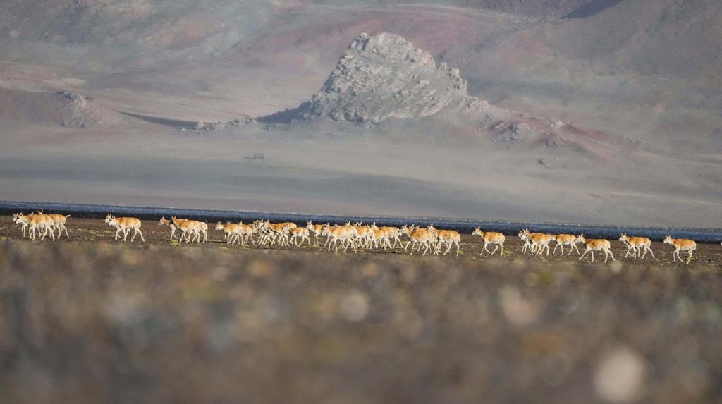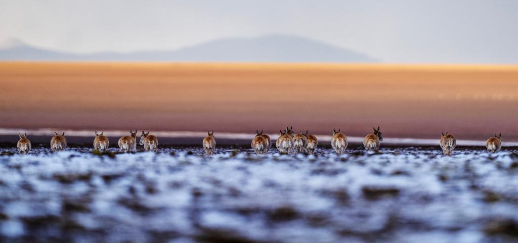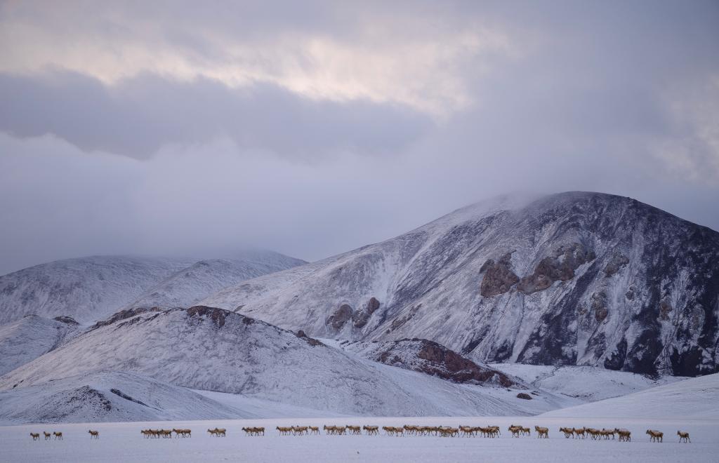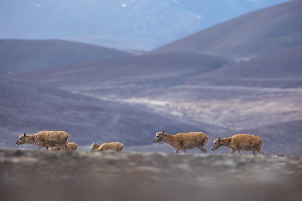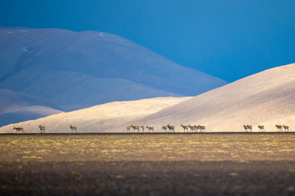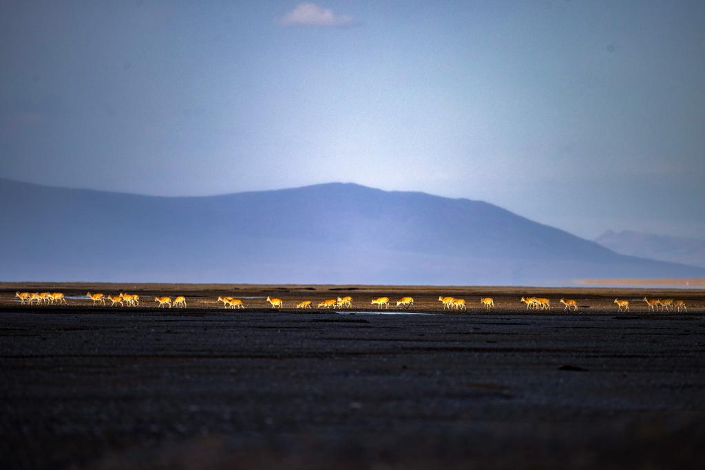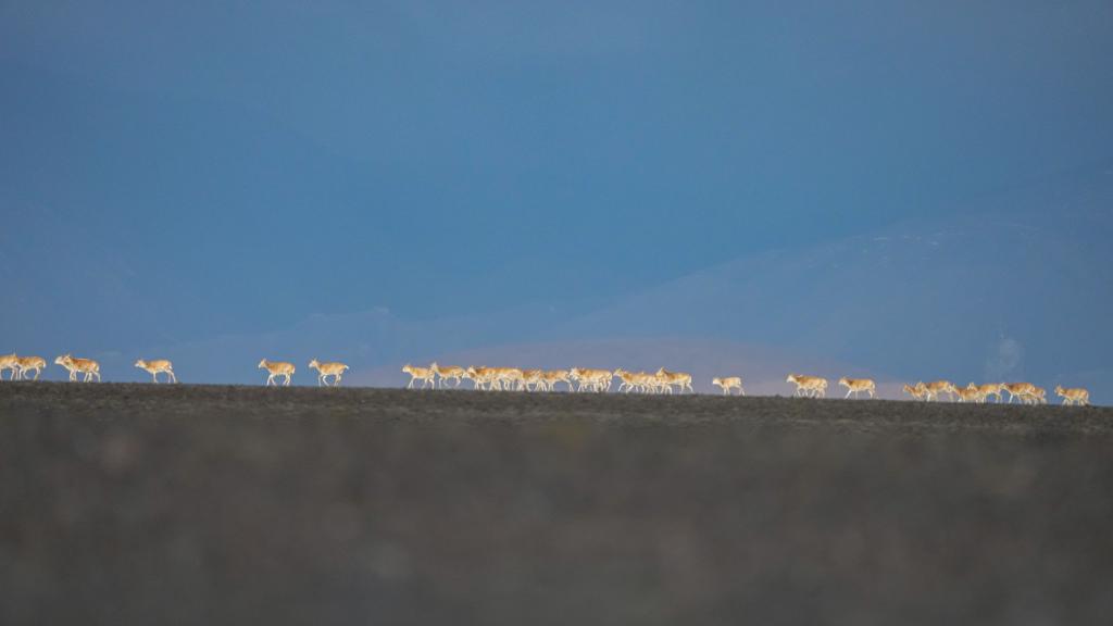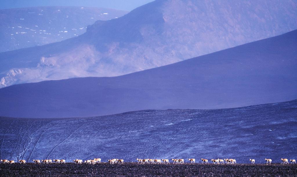 6月15日清晨在羌塘國家級自然保護(hù)區(qū)拍攝的遷徙中的母藏羚羊。