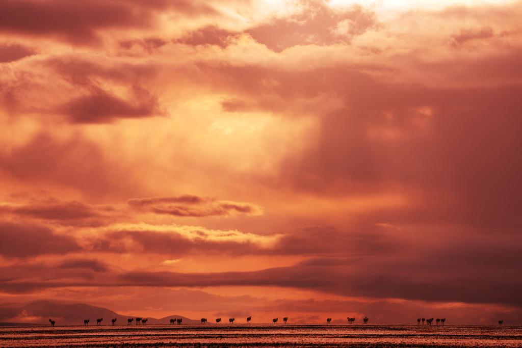 6月15日清晨雪后,在羌塘國家級自然保護(hù)區(qū),迎著朝霞前行在遷徙路上的一群藏羚羊。