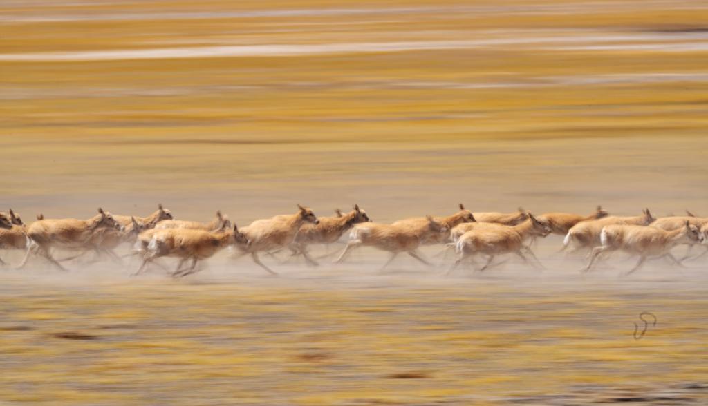 6月13日,在羌塘國家級自然保護(hù)區(qū),遷徙中的藏羚羊奔跑起來。