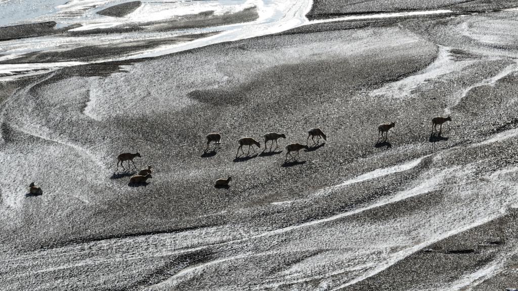 藏羚羊在甜水河畔雪地荒灘上向產(chǎn)羔地遷徙(6月15日攝)。