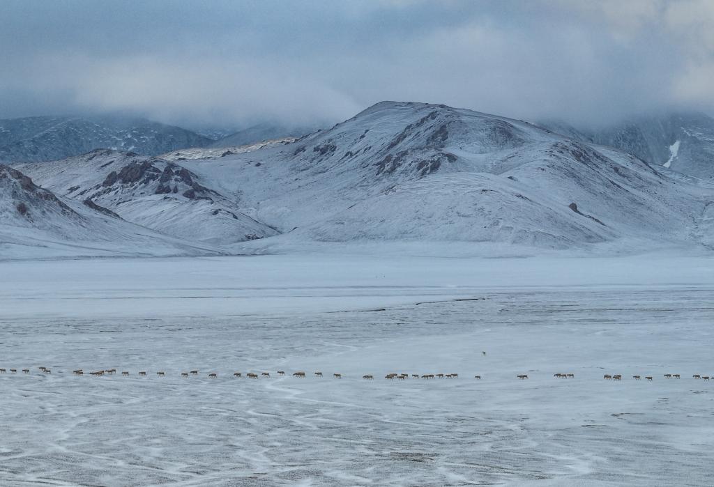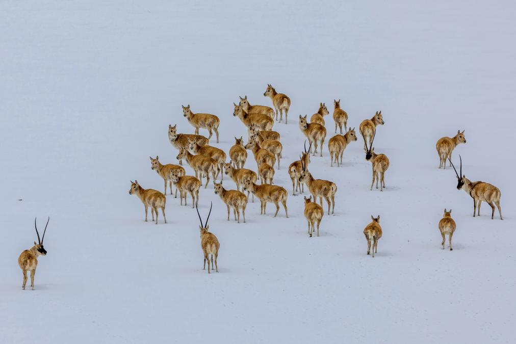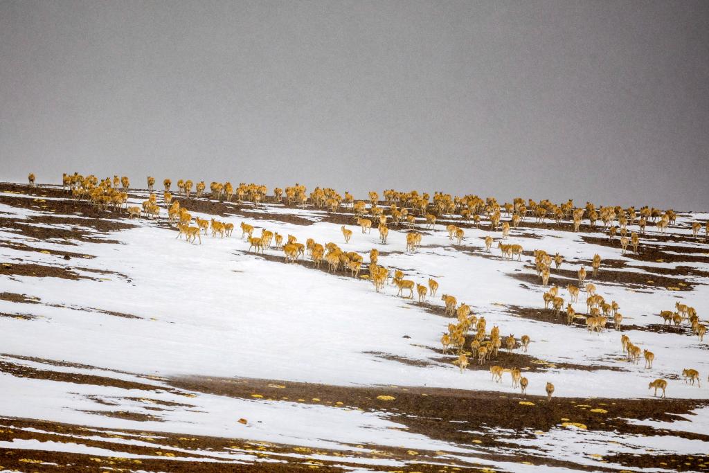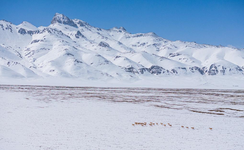大群遷徙的藏羚羊途徑甜水河畔的荒灘雪地,向產(chǎn)羔地遷徙(6月15日攝)。