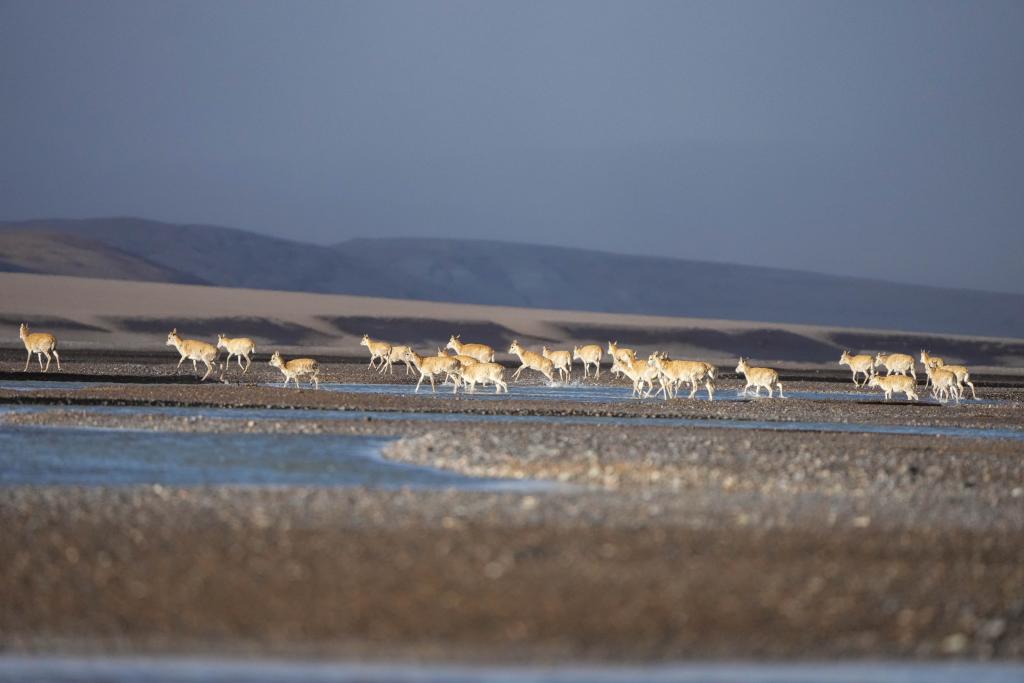 6月13日傍晚,在羌塘國家級自然保護(hù)區(qū),遷徙中的母藏羚羊越過甜水河。
