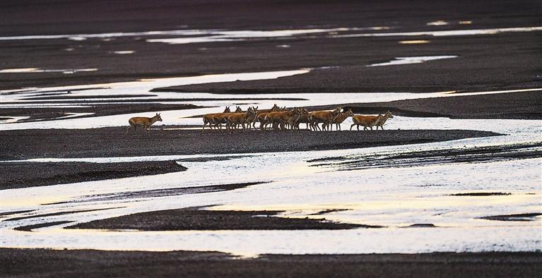 藏羚羊在甜水河畔雪地荒灘上向產(chǎn)羔地遷徙(6月15日攝)。 新華社記者 姜帆 攝