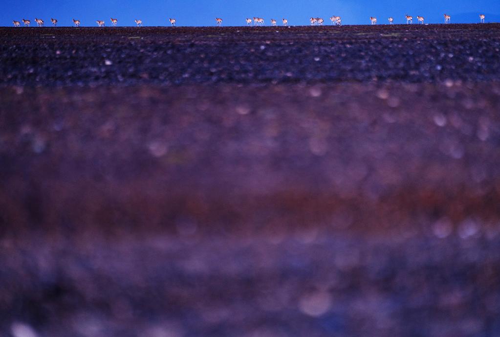 在羌塘國家級自然保護(hù)區(qū),藏羚羊在夕陽下覓食。