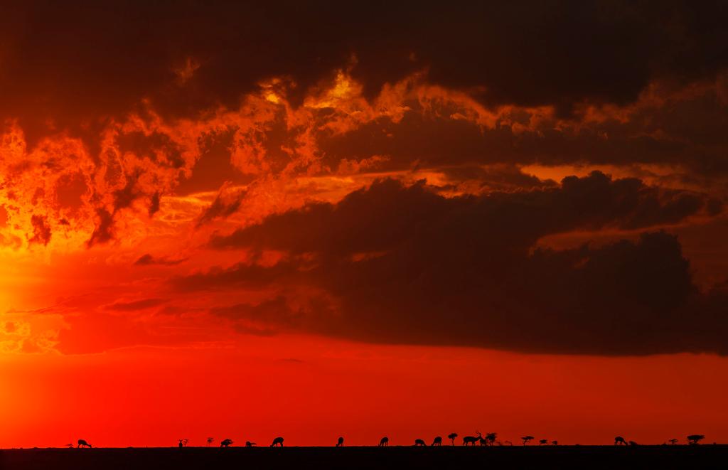 在馬賽馬拉國家保護(hù)區(qū),遷徙中的野生動物在夕陽下覓食。