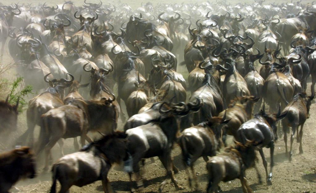 在千里之外的非洲,每年7月至9月,為了追逐水源和青草,數(shù)百萬頭角馬、斑馬和羚羊等食草動物組成一支浩浩蕩蕩的遷徙大軍,從坦桑尼亞塞倫蓋蒂國家公園向肯尼亞馬賽馬拉國家保護(hù)區(qū)遷徙,這就是東非野生動物大遷徙。當(dāng)數(shù)百萬頭野生動物從面積廣闊達(dá)數(shù)萬平方公里的塞倫蓋蒂,遷徙到僅有不到2000平方公里的馬賽馬拉的時候,遷徙達(dá)到高潮。