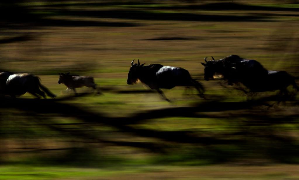 在馬賽馬拉國家保護(hù)區(qū),遷徙中的角馬因為感受到某種危險而奮力奔跑。