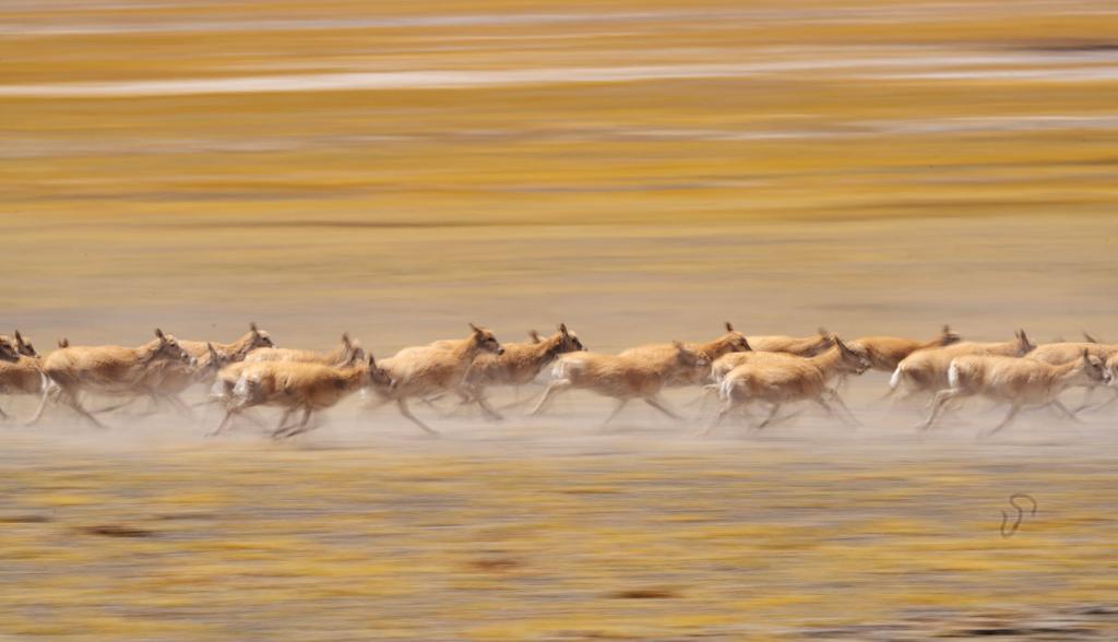 在羌塘國家級自然保護(hù)區(qū),遷徙中的藏羚羊因為感受到危險而奮力奔跑。