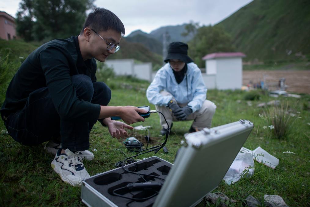 7月20日,在直門(mén)達(dá)水文站,長(zhǎng)江科學(xué)院空間信息技術(shù)應(yīng)用研究所廖茂昕(左)和付珺琳進(jìn)行土壤多參數(shù)檢測(cè)。新華社記者 伍志尊 攝