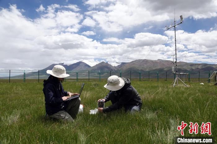 中國科學(xué)院申扎高寒草原與濕地生態(tài)系統(tǒng)觀測試驗站(申扎站)高寒濕地觀測試驗場,科研人員采集相關(guān)觀測數(shù)據(jù)。中新網(wǎng)記者孫自法攝