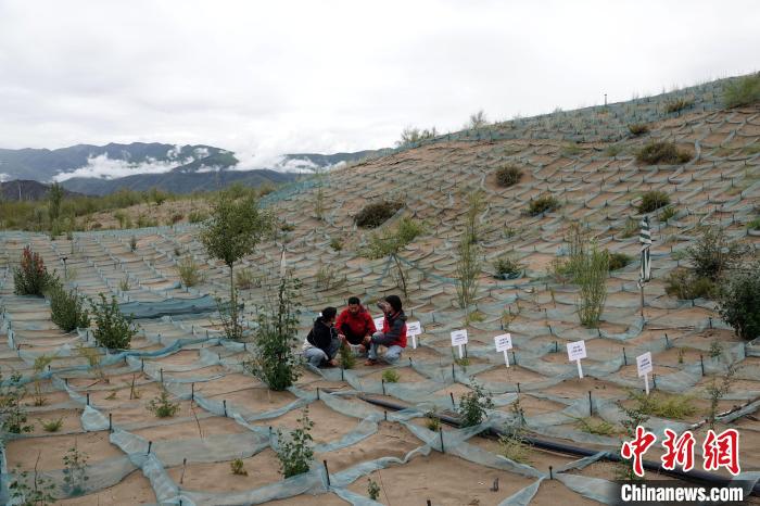 山南市全國防沙治沙綜合示范區(qū)(桑耶核心區(qū)),中國科學(xué)院成都山地所科研人員現(xiàn)場查看并交流。中新網(wǎng)記者孫自法攝