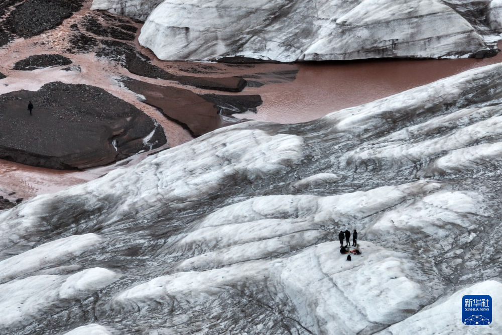 7月25日,在冬克瑪?shù)妆ǎ瓶缄爢T在探測冰川(無人機照片)。新華社記者 伍志尊 攝