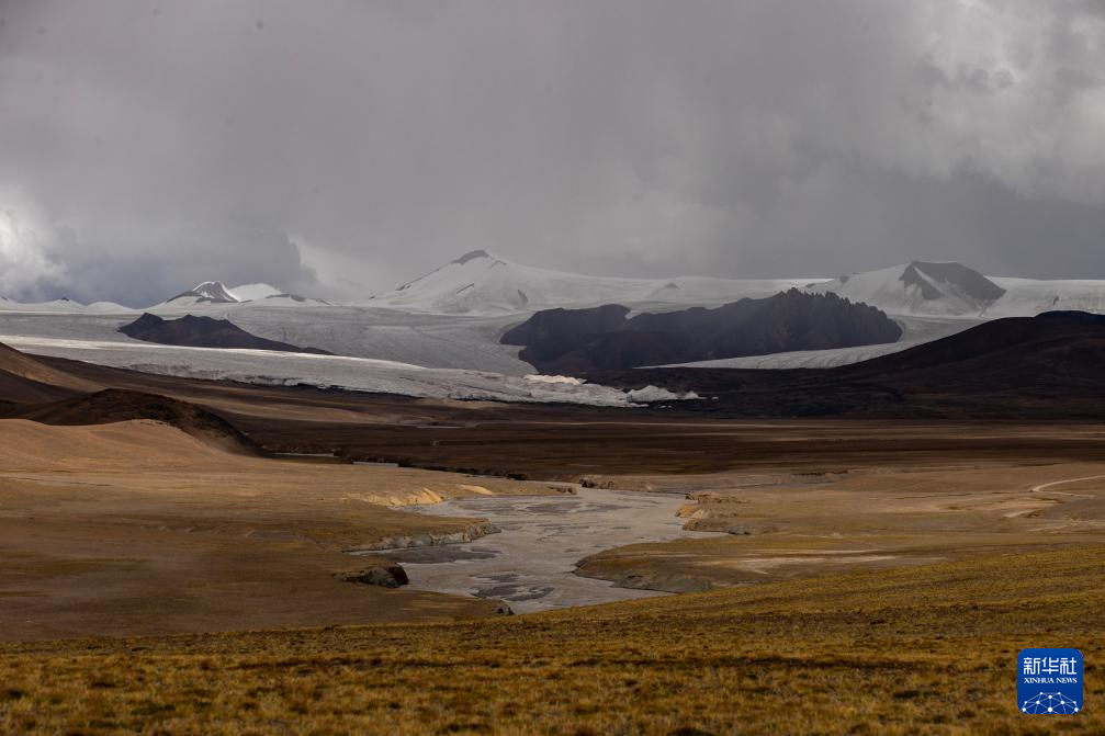 這是9月4日拍攝的普若崗日冰原8號冰川、消融形成的徑流以及遠(yuǎn)處的令戈錯(cuò)(無人機(jī)拼接照片)。新華社記者 姜帆 攝