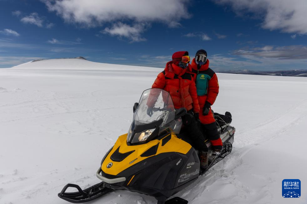 9月12日,科考隊(duì)員在雪地摩托上商量前往其他作業(yè)點(diǎn)的路線。新華社記者 姜帆 攝