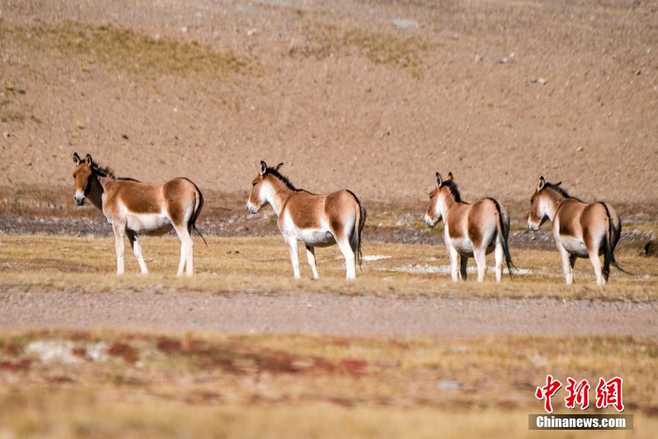 西藏羌塘草原位于昆侖山脈、唐古拉山脈和岡底斯山脈之間,是野生動(dòng)植物的天堂。近日,中新社記者探訪西藏羌塘草原腹地那曲市雙湖縣,看到當(dāng)?shù)夭亓缪?、藏野驢、藏原羚等野生動(dòng)物成群覓食,悠然自得。圖為10月3日,羌塘草原上的一群藏野驢悠閑覓食。