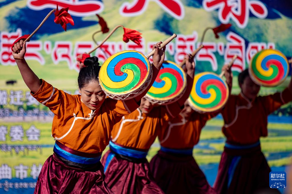 12月17日,森布日生態(tài)搬遷安置點(diǎn)居民在“物交會(huì)”開幕式上表演傳統(tǒng)舞蹈。新華社記者 姜帆 攝