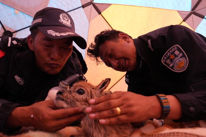 在可可西里無人區(qū)腹地卓乃湖附近,巡山隊隊員尼瑪扎西(左)秋松多杰(右)給剛救助的小藏羚羊喂奶(2024年7月8日攝)。新華社發(fā)(杜笑微攝)