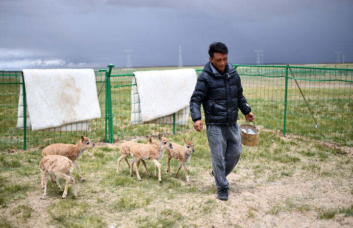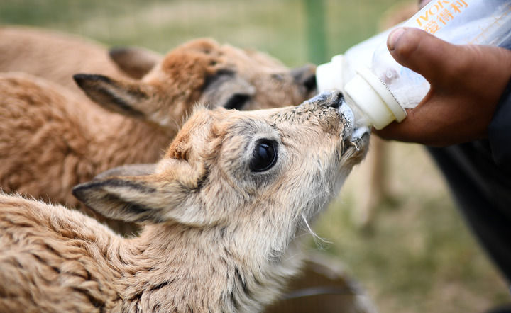 在索南達杰保護站,可可西里巡山隊隊員在給被救助的藏羚羊幼仔喂奶(2023年7月28日攝)。新華社記者 張宏祥 攝