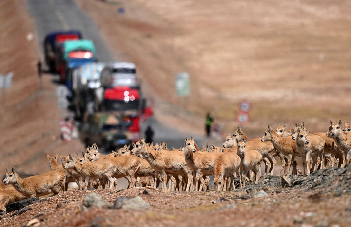 一群待產(chǎn)雌性藏羚羊通過青藏公路前往可可西里卓乃湖產(chǎn)仔(2023年5月29日攝)。新華社記者 張宏祥 攝