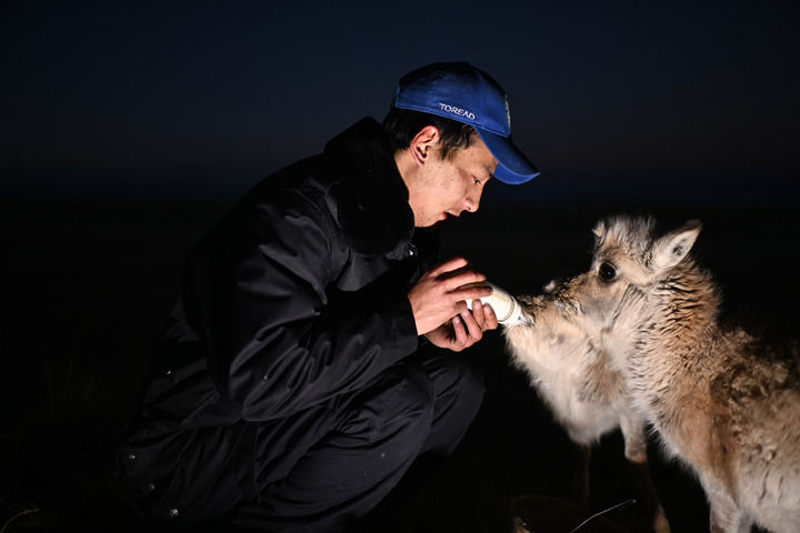 可可西里巡山隊隊員才文多杰在索南達杰保護站內(nèi)給被救助的藏羚羊幼仔喂奶(2024年1月18日攝)。新華社記者 張宏祥 攝