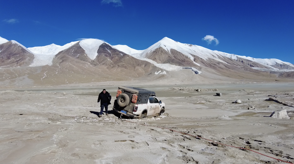 巡山隊員駕駛的車輛在布喀達坂峰山腳下陷入雪地中等待施救(攝于2025年1月14日)。新華社記者 杜笑微 攝