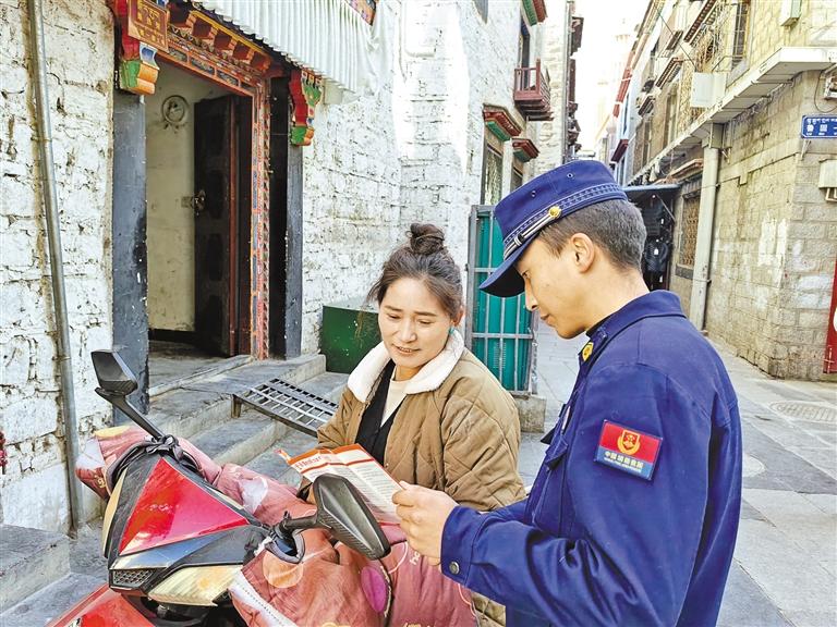 拉薩市消防救援支隊(duì)宣傳員向居民講解如何防范電動(dòng)車火災(zāi)。