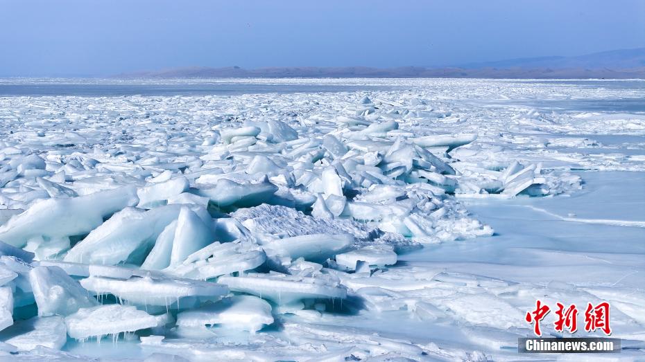 2月13日,青海省海南藏族自治州青海湖南岸,堆積在岸邊的冰塊在光線照射下呈藍(lán)冰景象,與周邊雪山、藍(lán)天、沙漠等大自然景色巧妙融合,吸引游客和攝影愛好者前來(lái)觀賞。圖為航拍青海湖藍(lán)冰。