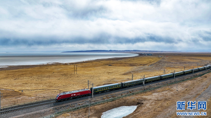 2月15日,青海湖北岸,一列火車經(jīng)過(無人機照片)。新華網(wǎng)發(fā) (宋忠勇 攝)