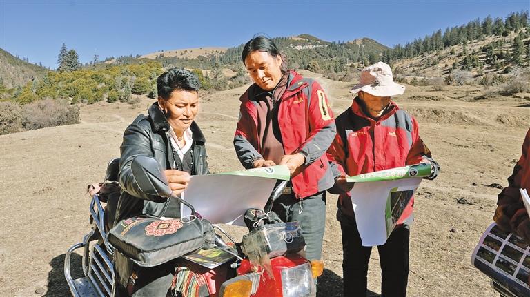 貢覺縣則巴鄉(xiāng)衛(wèi)通村的護林員向上山放牧的牧民宣傳護林防火知識。記者 貢秋曲措 通訊員 董燕 西繞丹青 攝